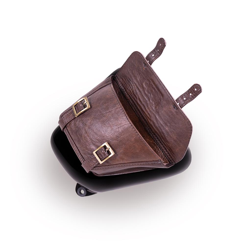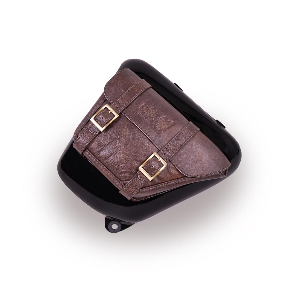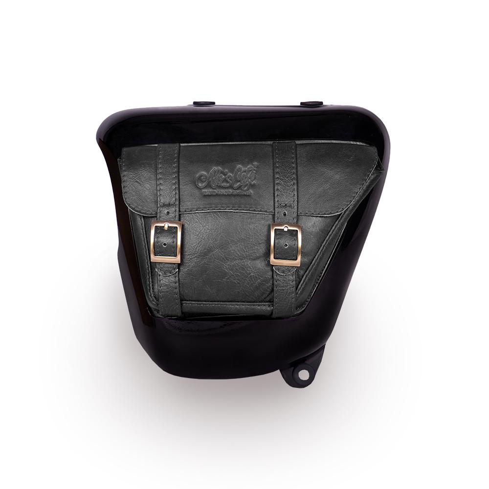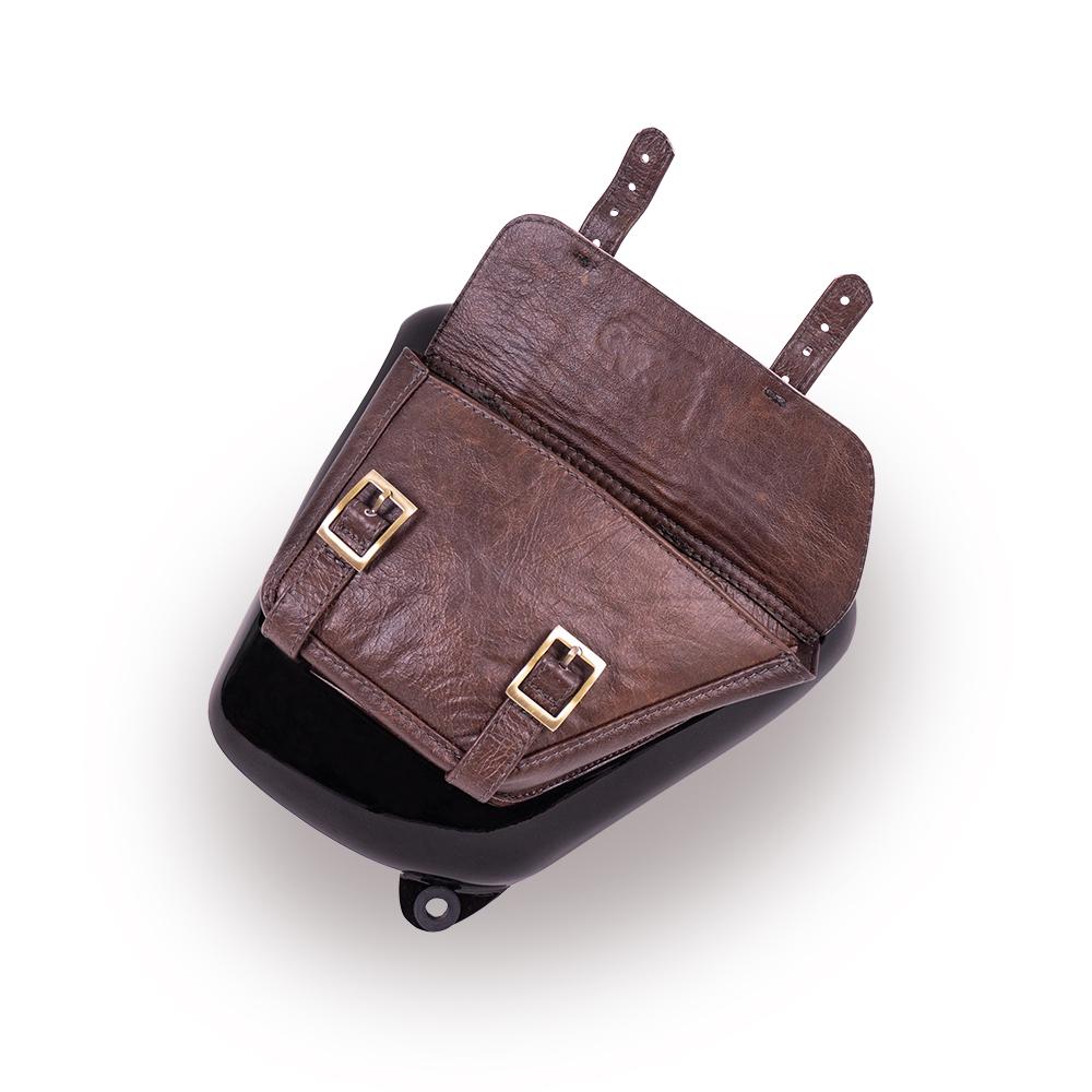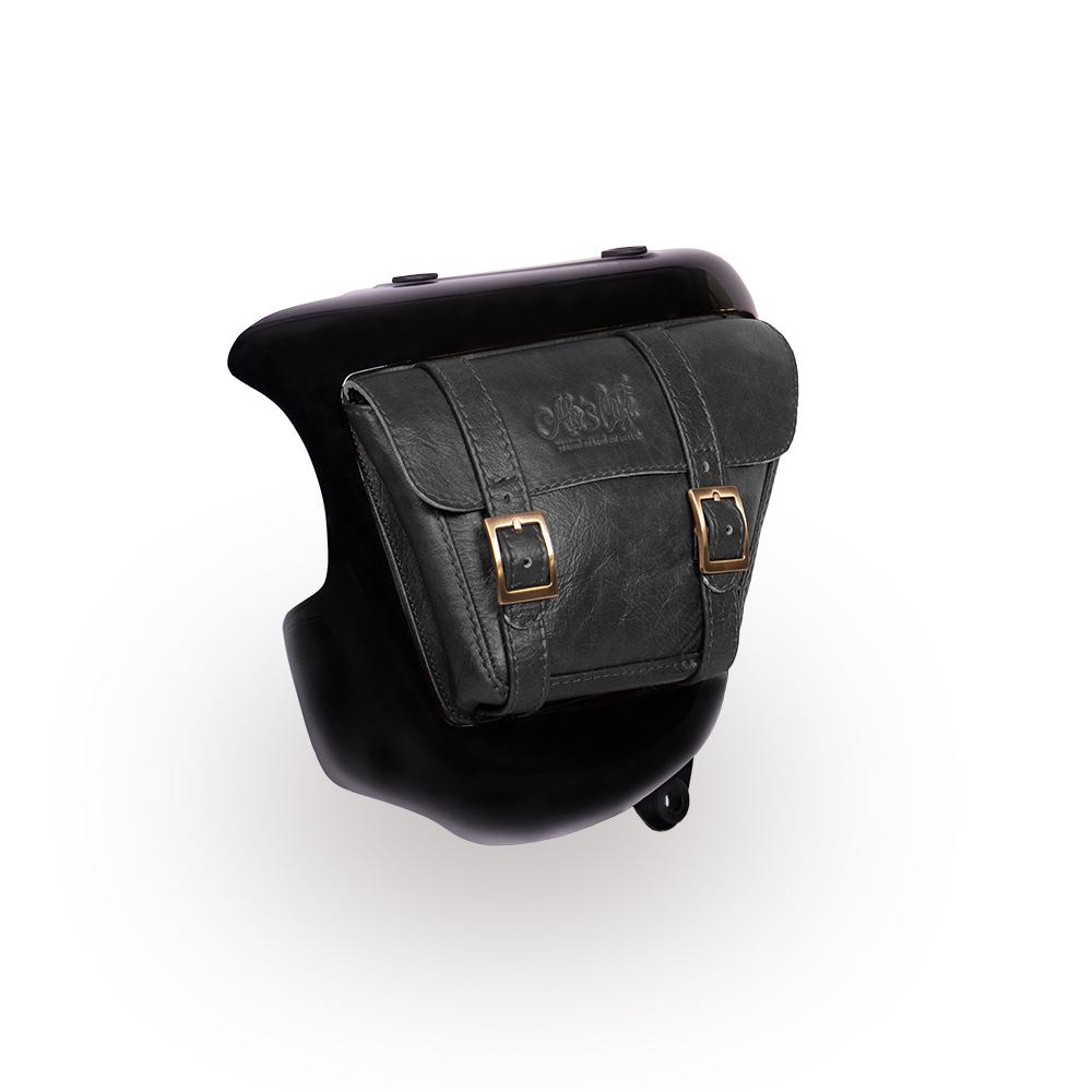 Fiberglass side panel painted in jet-black gloss with integrated leather storage bag. This simple addition awards your bike the elegance it deserves and allows you to store small objects from your pocket that could potentially fall out during your journey.